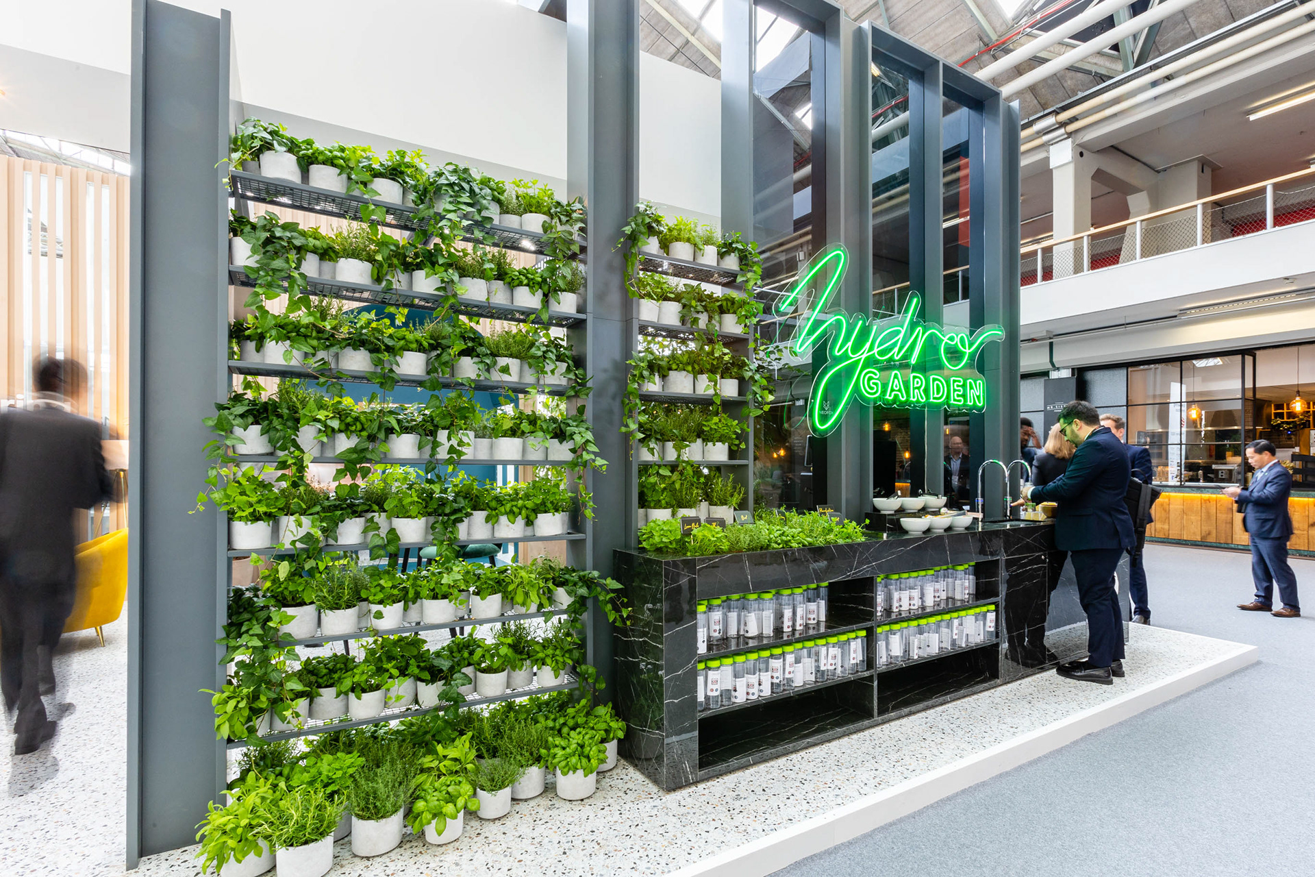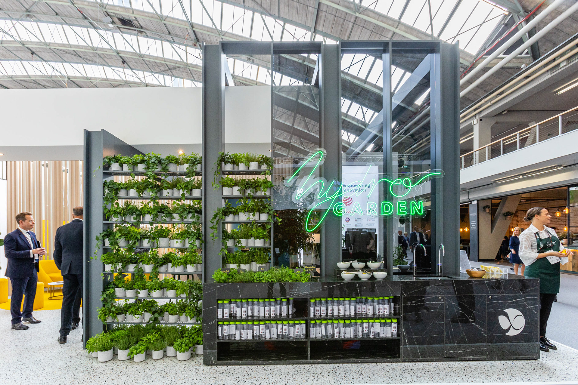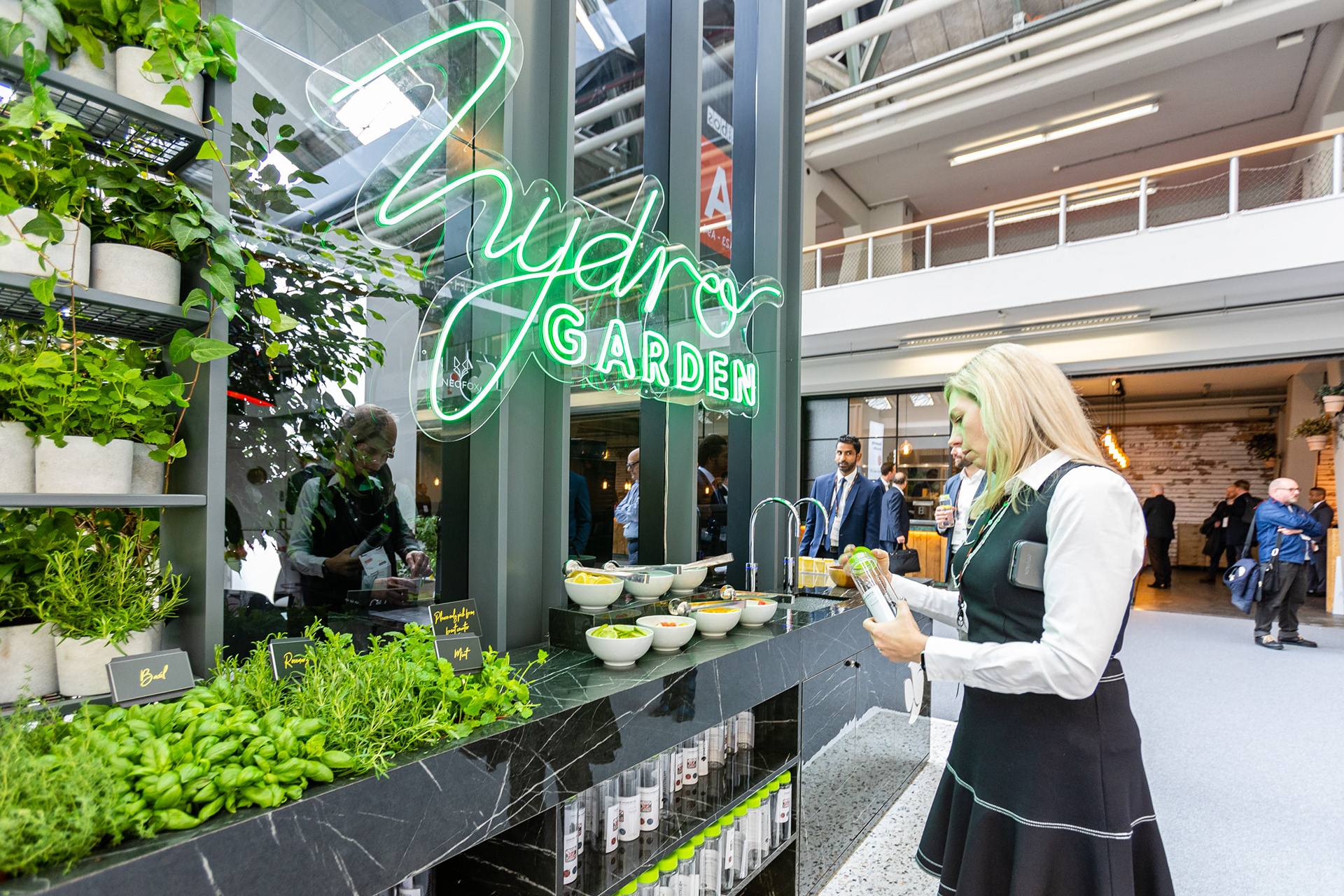 An illuminated logo was designed to promote the stunning herb infused water garden at Sibos in Amsterdam. A fluid hand drawn design was chosen to compliment the clean lines of the company stand.