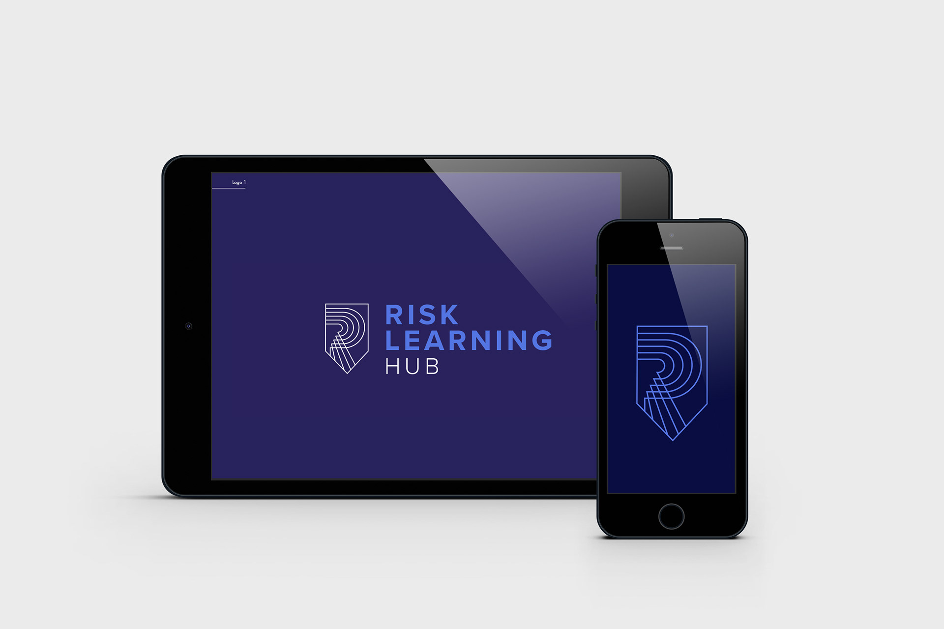 Start up identity for the Risk Learning Hub. The shield provides a strong holding shape representing trust and assurance. The traveling lines animate and represent the channels of learning and information flow.