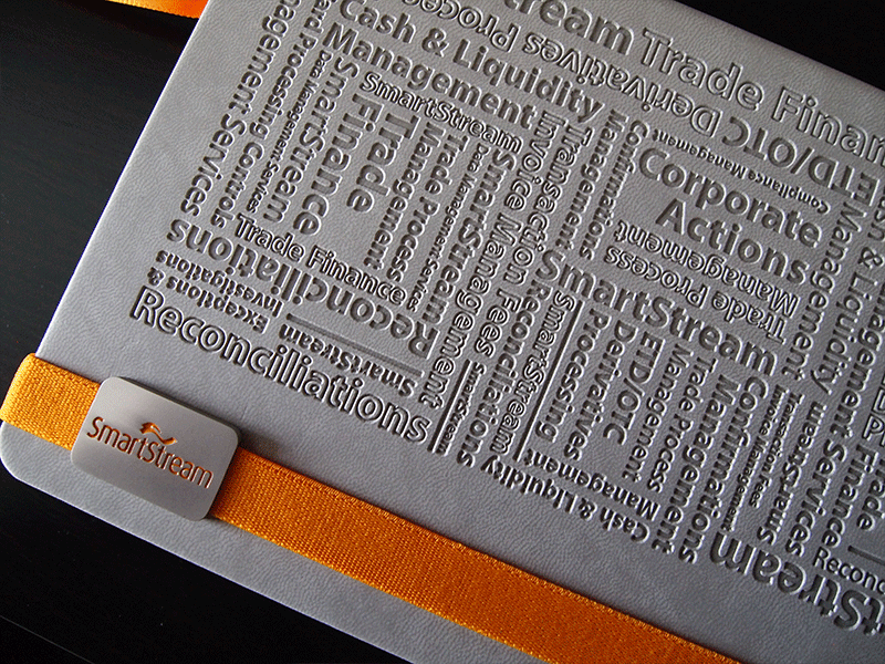 Branded notebooks designed to promote the company solutions. Debossed to create texture and interest in stone suede cover.